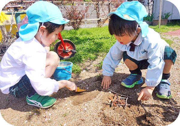 子どもたちがやりたいことを見つける力、自分で遊びを考える力を大切にしています。 廃材を使った工作では、いろいろな素材に触れながらイメージを形にしたり、戸外でのびのびと過ごしながら虫探しをしたり、オニごっこのルールを覚えてみんなで体を動かしたり・・・。 保育者が一緒に遊んだり、時には見守ったりしながら、子どもたちが自分でやりたいことを考えて取り組み、遊びを充実させていく力を伸ばしていってほしいと考えています。