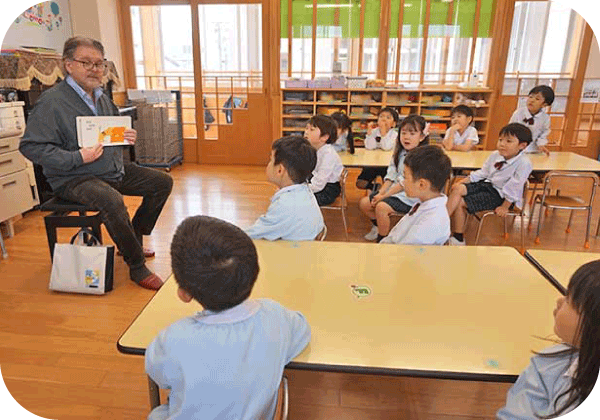 外国人講師による英語教室です。英語の歌に合わせて身体表現をしたり、外国の絵本や絵カードを見ながら英語に触れて外国の文化に親しんでいます。