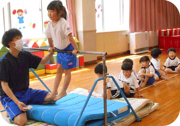 カワイ体育教室の先生と一緒に身体を動かし、基本的な体の使い方を楽しくわかりやすく身につけていきます。 跳び箱や鉄棒、マット運動、なわとびなどはもちろん、ボールを使ったゲームや表現活動ど楽しんで参加できる内容です♪ 年長児になると運動会で組体操の発表があり、子どもたちは練習を積み重ねていく中で上達してく充実感を味わっています。